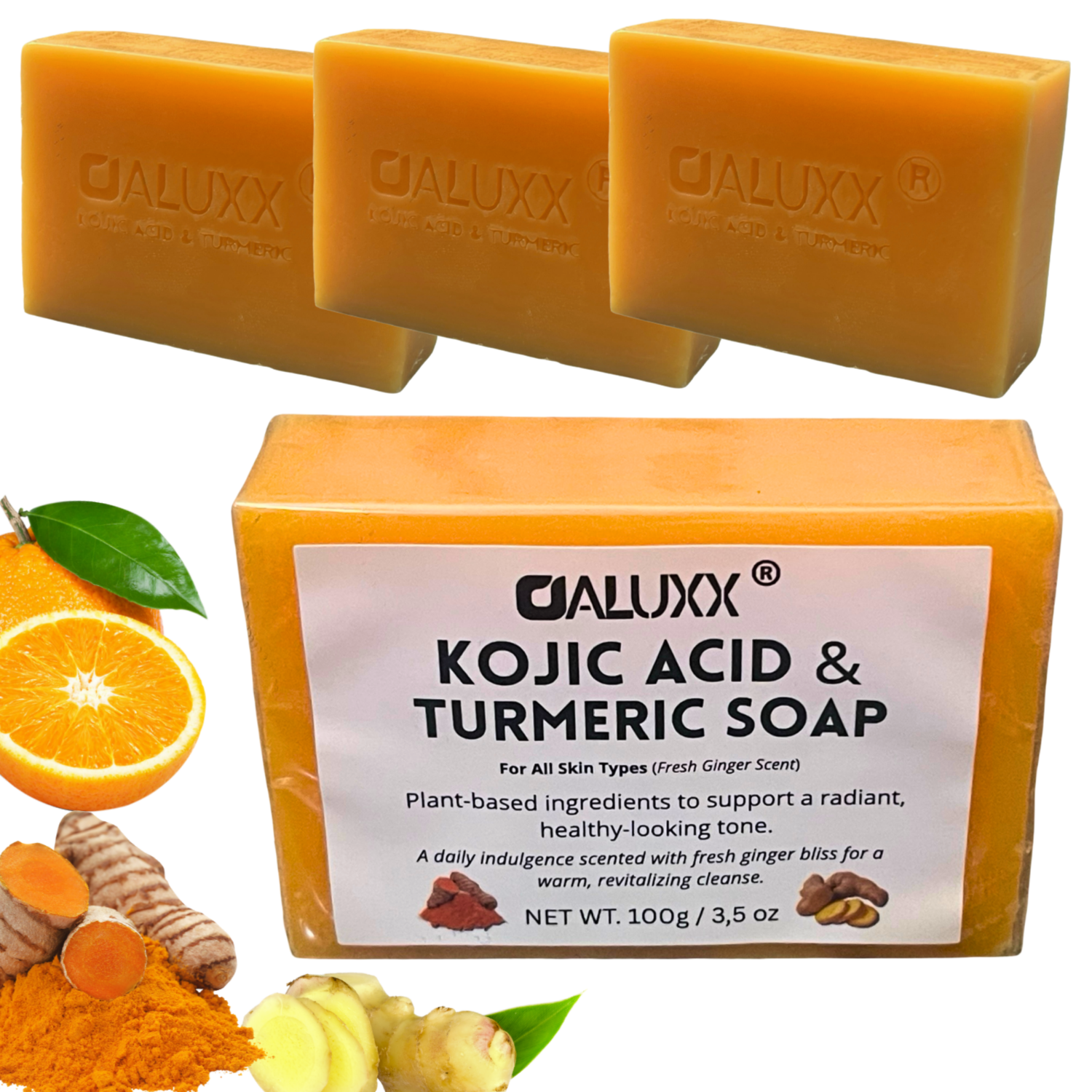OALUXX Kojic & Turmeric Soap gently exfoliates and smooths your skin — safe for face and body, with a fresh ginger scent that makes daily use a refreshing ritual.
